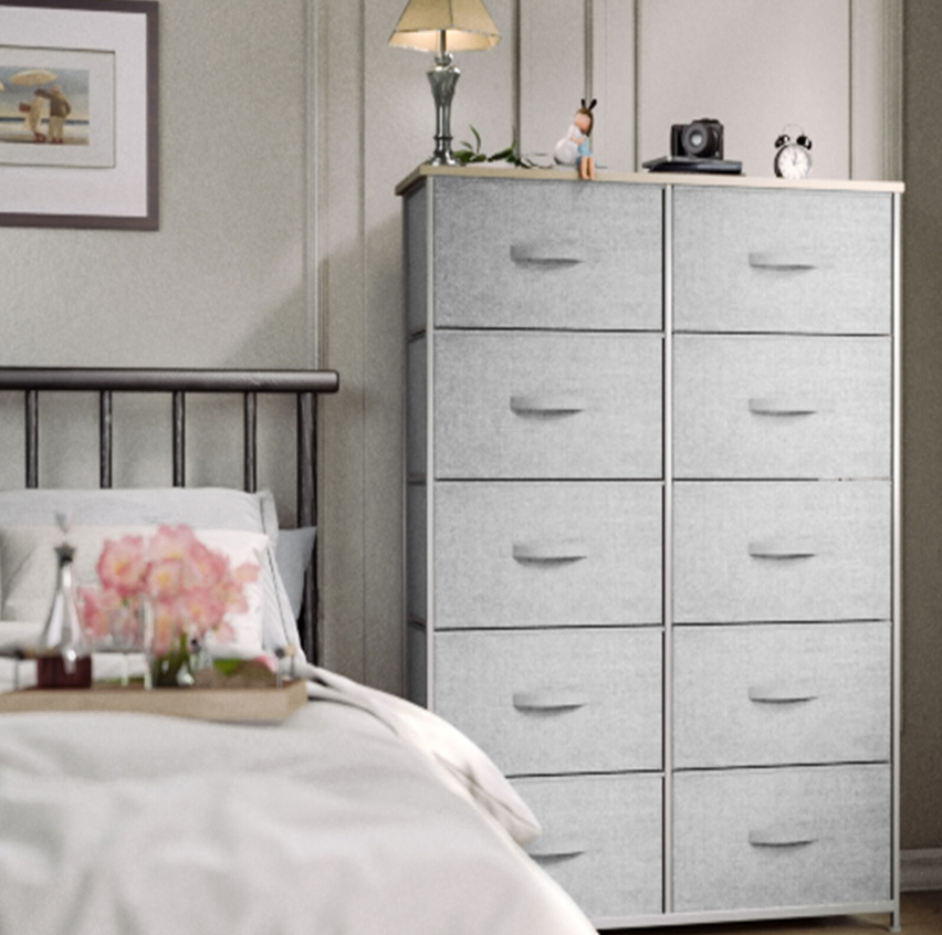 QUALITY CONSTRUCTION - Made with a powerful metal frame and durable MDF wooden top; contains 10 removable and foldable drawers with easy-to-pull fabric handles; features 4 adjustable plastic legs that prevent scratches to your floor.