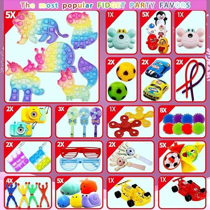 • ?【Amazing Gift Prizes and Rewards】:This fidget party favor set is a great gift for men, women, children, family, and friends. Perfect for Christmas gift stuffers, christmas stocking stuffers,easter basket stuffer for kids, Valentine's Day kids birthday party favors, school classroom rewards, carnivals prizes, treasure box, party giveaways, pinata fillers, goodie bag fillers, Easter basket stuffers, Halloween party giveaway.
