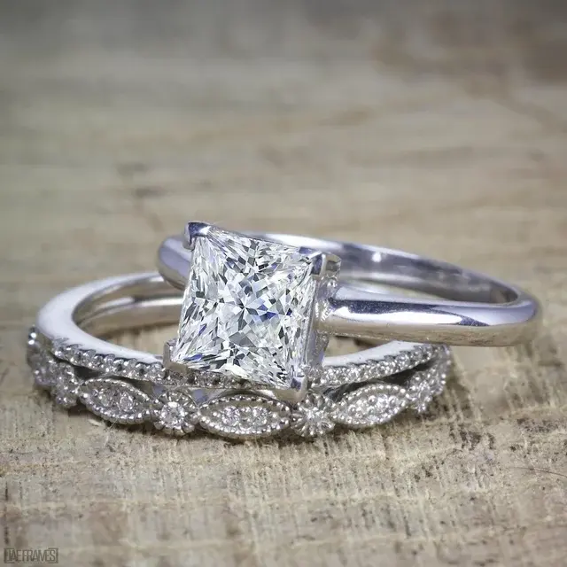 A perfect handmade Wedding Trio Ring Set, comes with Main solitaire engagement ring, and 2 matching art deco wedding bands. The beautiful bridal trio set is the perfect design for her. The collect of 3 Rings, the trio ring set is affordable and now available on sale price for limited time. The beautiful princess solitaire engagement ring is surrounded with 2 vintage style art deco wedding bands. Hand carved and designed, the perfect wedding ring set for her.