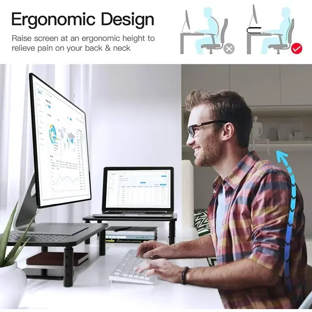 1. 3 HEIGHT ADJUSTMENTS - This monitor stand comes with 3 adjustable height levels allowing you to choose the most ergonomic, healthiest, and most comfortable viewing angle while working. Simply press the button on the leg and lift the platform to adjust between the different height levels