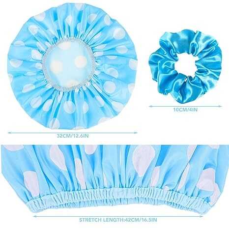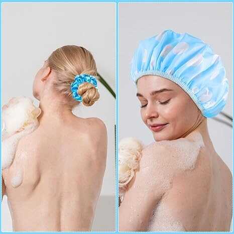 • ?【Shower Cap Set】The set provides 2 hair ties for those with long hair, which makes wearing the shower cap easier and faster. The hair tie is also very beautiful for daily use.