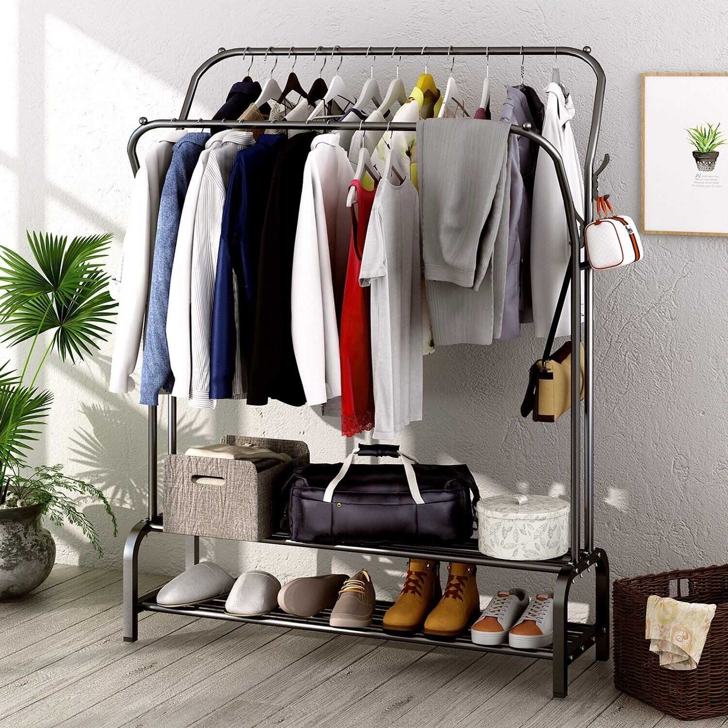 Adjustable, Double bottom shelves,Portable, Heavy Duty, 8 Hangers, 2 Shoe Shelves, Hanging, Large Capacity
