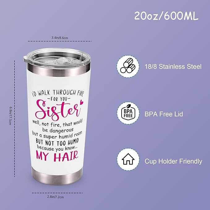 • 20oz Tumbler with Straw Lids: This tumbler makes a perfect birthday gift for best friends, or sister. It's a funny and unique gift option. The warm message "I would walk through fire for you sister" adds a touch of fun and inspiration.
