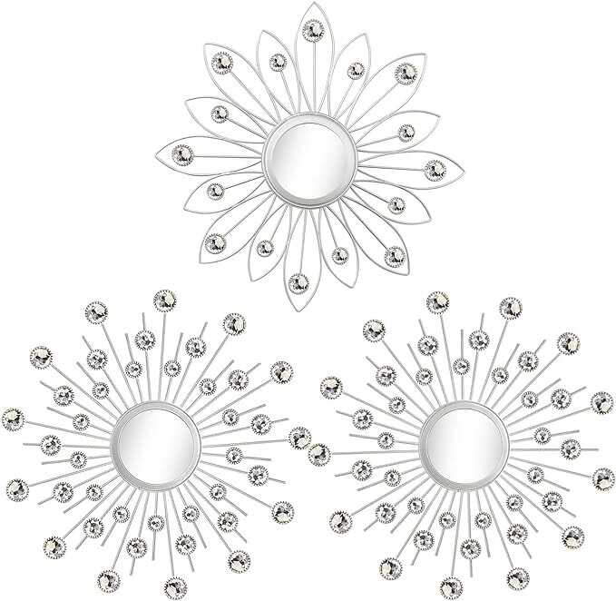 • 【CAPTIVATING FIND ON WALL】PACK OF 3. Measuring at 13.5" Diameter with silver metal frame and 4" Diameter for the mirror alone. These metal artpieces work great alone, or as a set with other multiple matching wall decors.