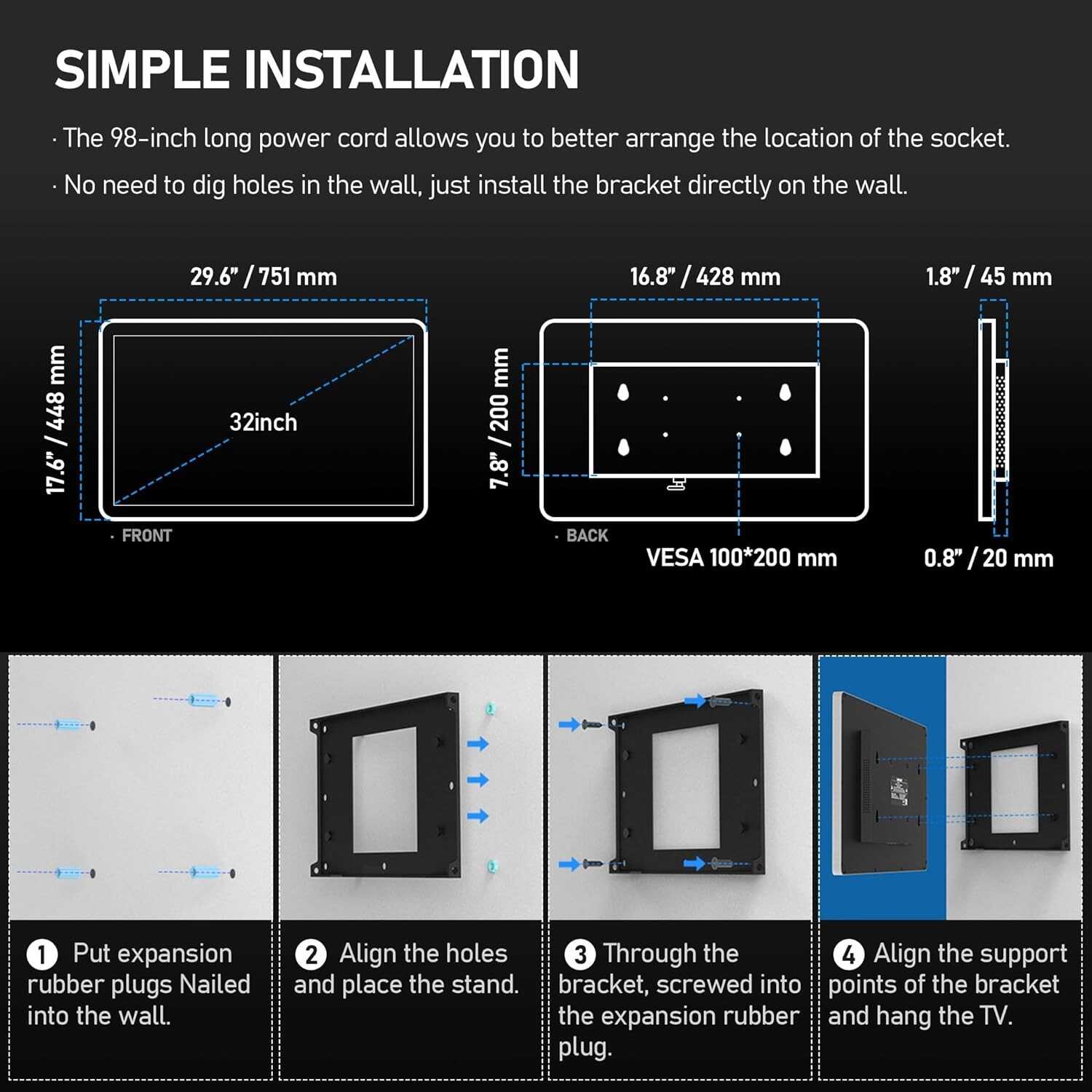 TV Wall Mount Size17 " × 8.5 " × 0.6 " (432 × 215 × 16 mm )
