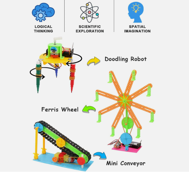 This 5 set stem kit can be build Mini Tank, Doodling Robot, Aircraft Car ,Mini Conveyor, Ferris Wheel,during build these kit can develop children's practical ability of using hands and brain.