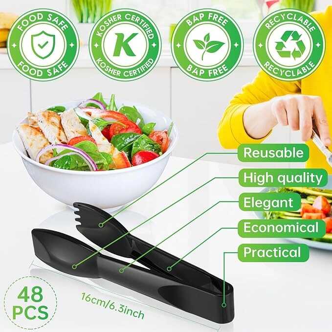 • 48 Pieces of 6 Inch Plastic Tongs: each serving tong is 6 inches long, easy to grip, and comfortable to use; Convenient design is nice for all your dinner party, catering or buffet needs; They can be hand washed and reused, or discarded after one use
