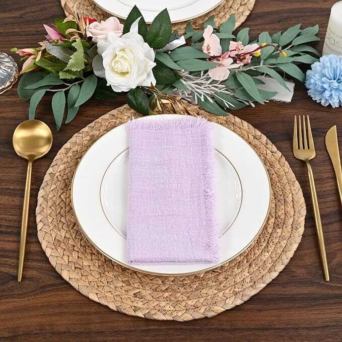 • ?️Napkins Features: Handmade lilac napkins feature a delicate tassel design, edges on all four sides are carefully hand-pulled for an elegant 0.5" fringe, not easy to break and knot, Practical with added elegance, purple napkins always can improve the guest experience very well, making the meal more enjoyable.