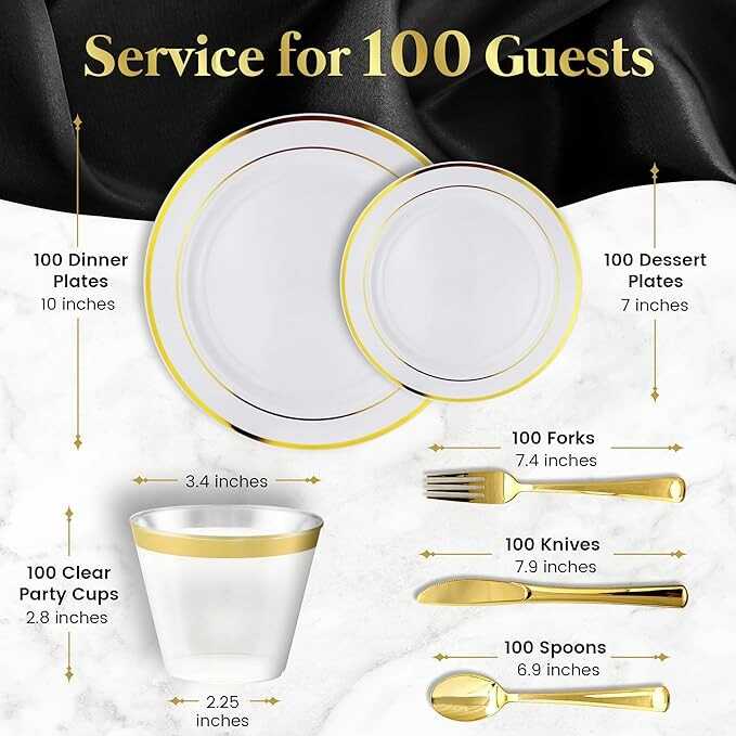 • WE STAND BEHIND OUR PRODUCTS: Our high quality gold plastic dinnerware sets offer tremendous value for your gatherings but if for any reason you are not happy with the product please let us know. If any portion of the set is damaged due to shipping, please contact us for FREE REPLACEMENTS of the damaged items.