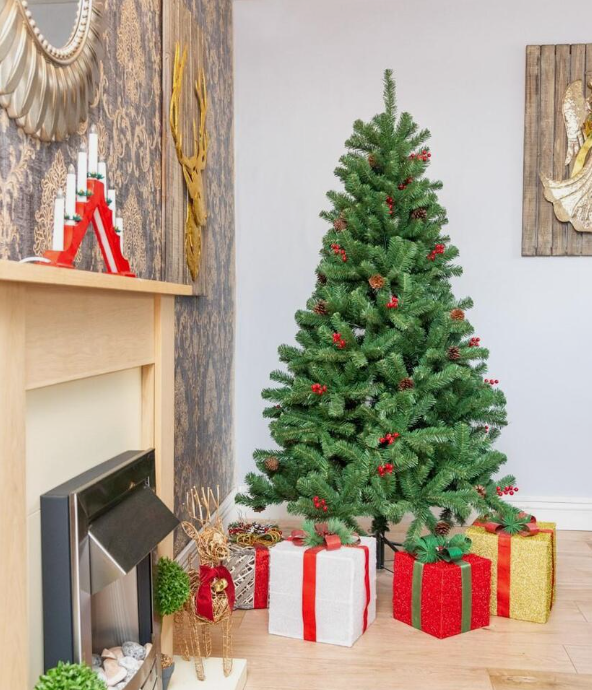 ? Description: Embrace the traditional Maryland Fir design, offering a natural look with a wealth of space for decorations. The tree's sturdy build, eco-friendly PVC material, and decorative pine cones & berries make it a delightful centerpiece for each festive season.