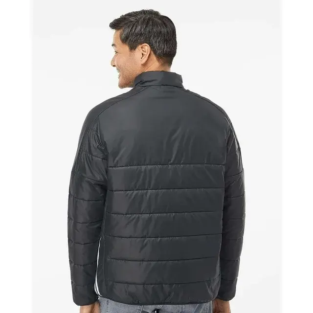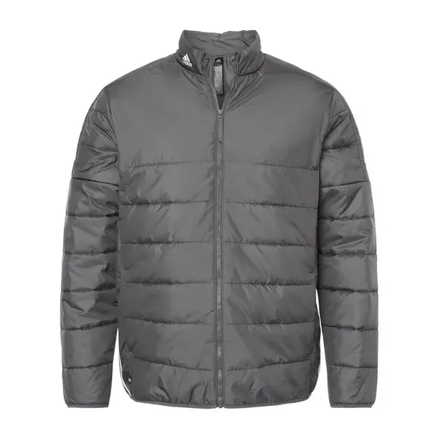 2 oz./yd² (US), 3.3 oz/L yd (CA), 100% recycled polyester. Contrast adidas logo on right collar. Baffle construction. 3-stripe logo on sides. 3.4 oz /yd², 100% recycled polyester synthetic fill.
