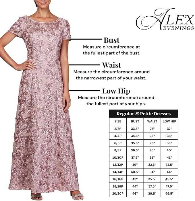Sizes for Every Woman: At Alex Evenings, we embrace the beauty of every woman. Our inclusive sizing, from Petite to Regular, and Plus sizes, ensures that our dresses are designed to complement various body types. Find your perfect fit for any special occasion.