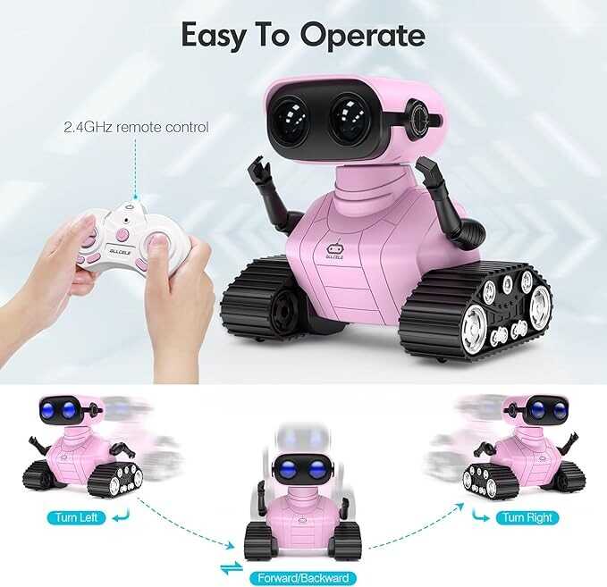 ?Multifunctional Robot: LED eyes will light up once you turn on the robot, you can also closed it or let it blink by remote; voice function - turn on the robot it will start talk with you in his own language, he can also sing 3 songs which can swich by remote; the tank tracks - let the robot move forward backward left and right,when it switch to demo mode it will begin dancing.