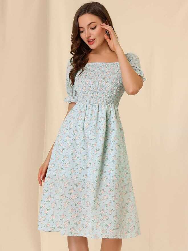 Allegra K Women's Square Neck Puff Sleeves Casual Midi Smocked Floral Dress