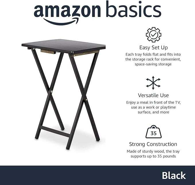 AmazonBasics Classic TV Dinner/Snack Table Set - 4 Tables with 1 Holding Rack - Black