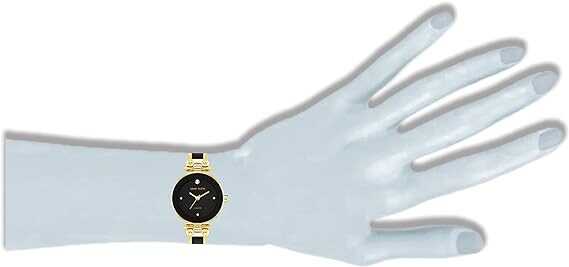 • Mineral crystal lens; glossy black dial with genuine diamond at 12; gold-tone hands and markers