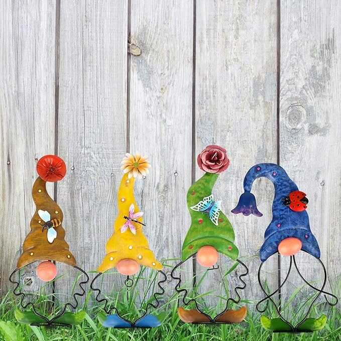 Art Elf Garden Gnomes Decorations for Yard Decorative Stake Decor Art Outdoor Metal Sculpture Figurines for Patio Outside Lawn Pathway Ornaments 4 Packs