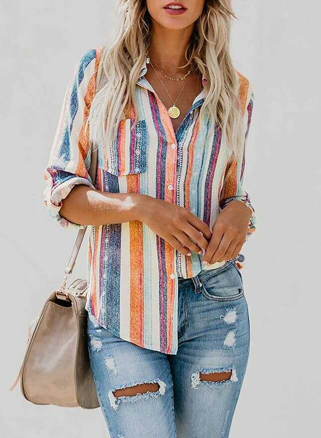 • Features: Button down, V neck, Stripes, Color Block,Cuffed Sleeve