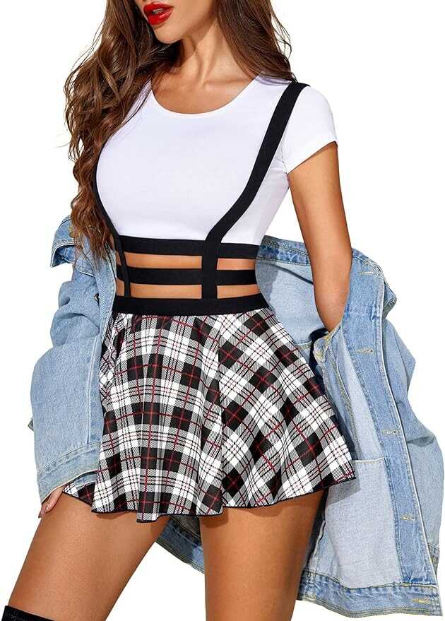 ✿ Feature: Pleated mini skirt features in elastic suspender, A-line style,elastic waistband, easy to find your suitable but not tight foor you. Two strpas around your belly and waist, unique style makes you more slim and charming.