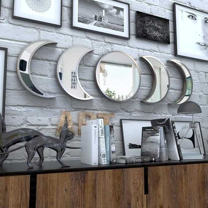 • MOON MIRROR SET INCLUDES - We've designed our moon mirrors to reflect light throughout your home and add brightness to any room. This moon phase mirror set of 5 mirrors includes: (Round) full moon mirror x 1, half-moon mirrors x 2, crescent-moon mirrors x 2. We've also included a hanging template, nails, and an easy-to-understand manual, for easy installation, so you can wall-mount your new moon mirrors with ease.