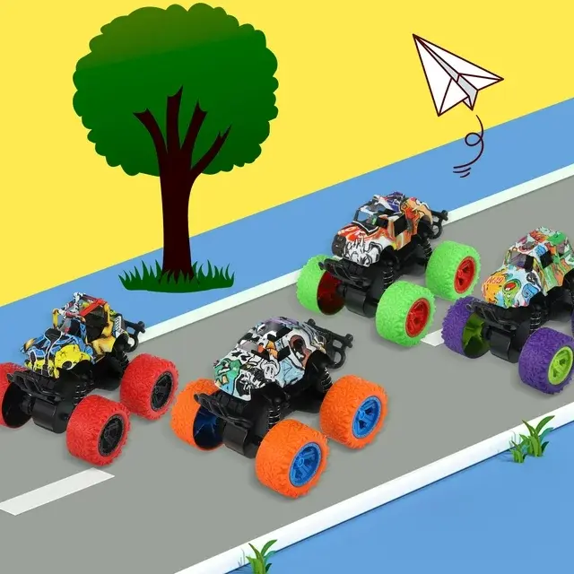 This product is a fun battery-free stunt car set that includes 4 cute trucks. These truck toys come in 4 different eye-catching bright colors: red, orange, blue, green, which stimulate toddlers' recognition of colors and bring life to any kid's room.