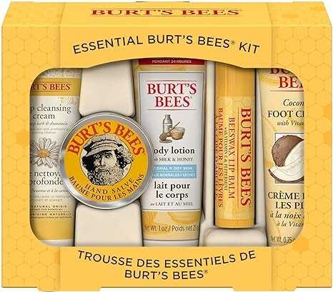 • SKIN CARE PRODUCTS: Pamper from head to toe with this giftable set including 5 travel size Burt's Bees favorites: Soap Bark and Chamomile Deep Cleansing Cream, Hand Salve, Milk & Honey Body Lotion, Coconut Foot Cream and Beeswax Lip Balm; Package may vary
