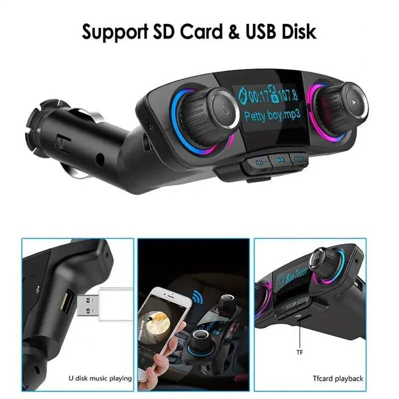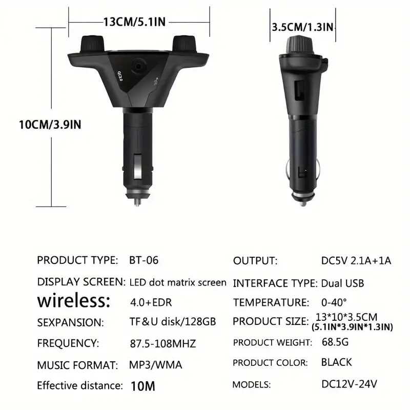 1. Main functions of the product 1. Wireless version 5.0, supporting wireless calls, wireless music transmission, call number reporting 2. Support TF card/U disk playback and card reader function, support MP3/WMA format music 3. Dual USB charging single portQC3.0can be used for external expansion of portable device functions, suitable for charging all mobile phones, tablets and other electronic products