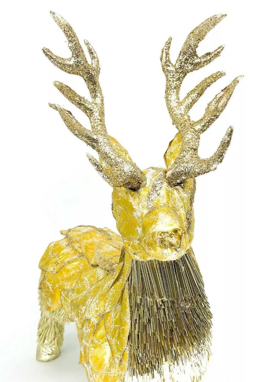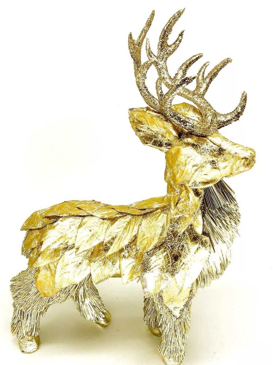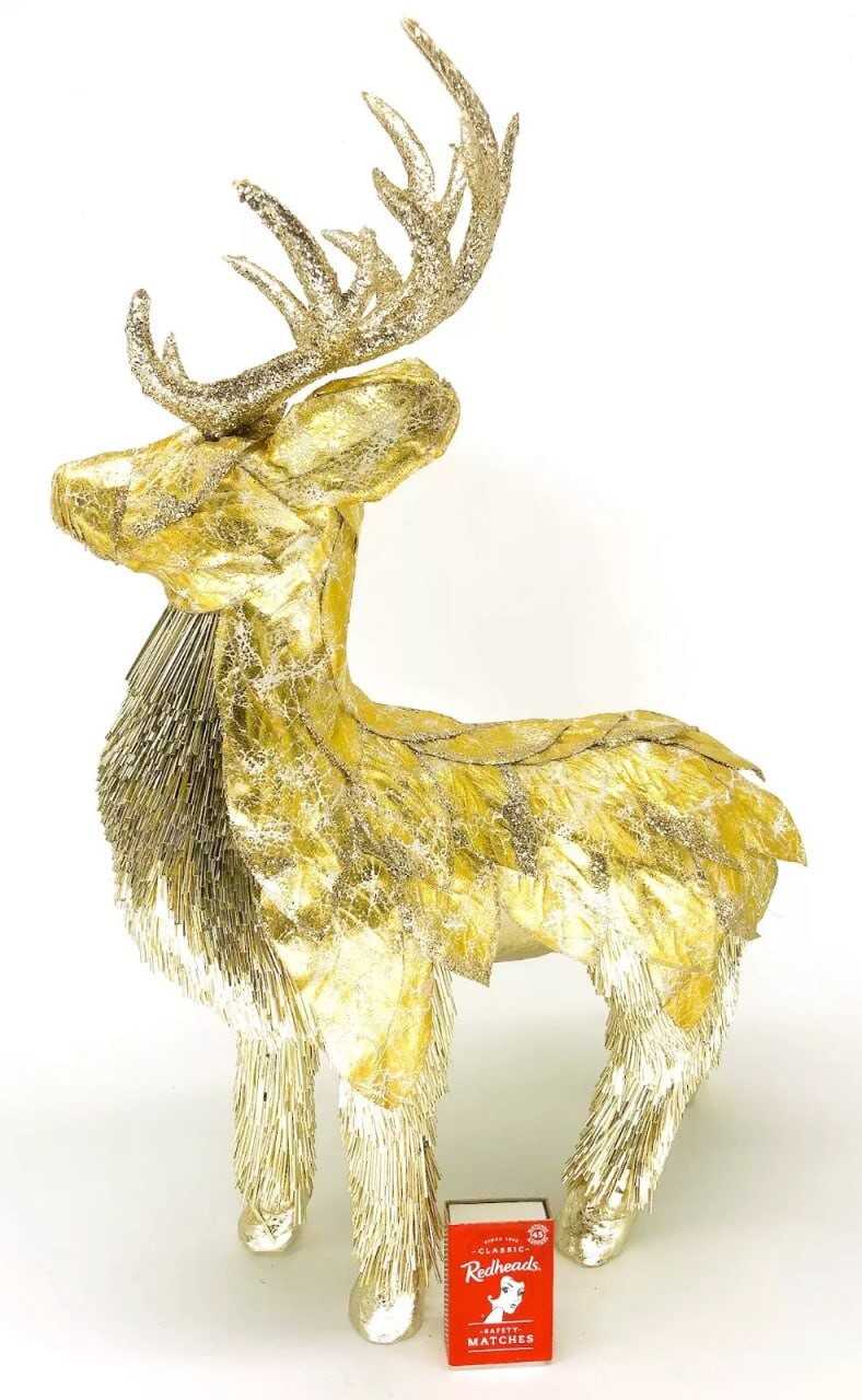 Large stand alone Christmas reindeer mantle or table decor covered with gold fabric leaves and lots of glitter. This is super sparkly!  I have two of these available if you are interested. No damage. Please see photos for size comparison.