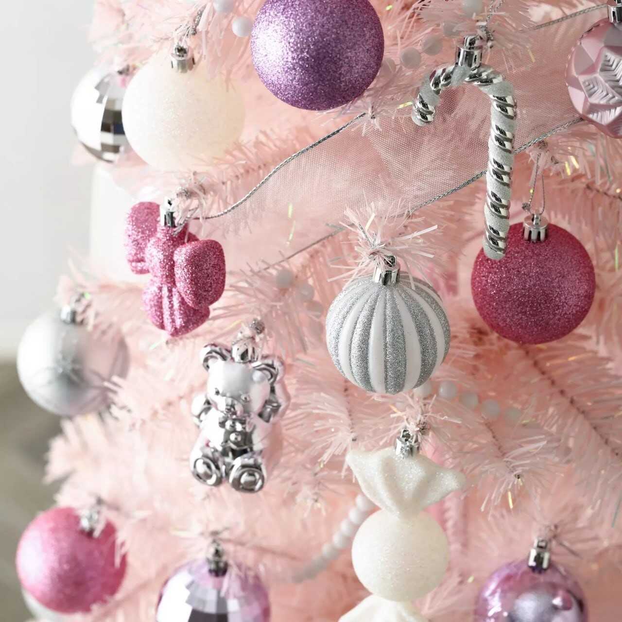 A pink tree with 51 cute ornaments such as bears and candies. Decorate with your family and loved ones and enjoy the exciting time of welcoming Christmas.