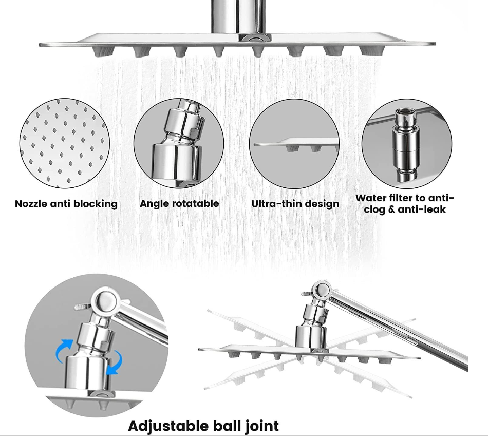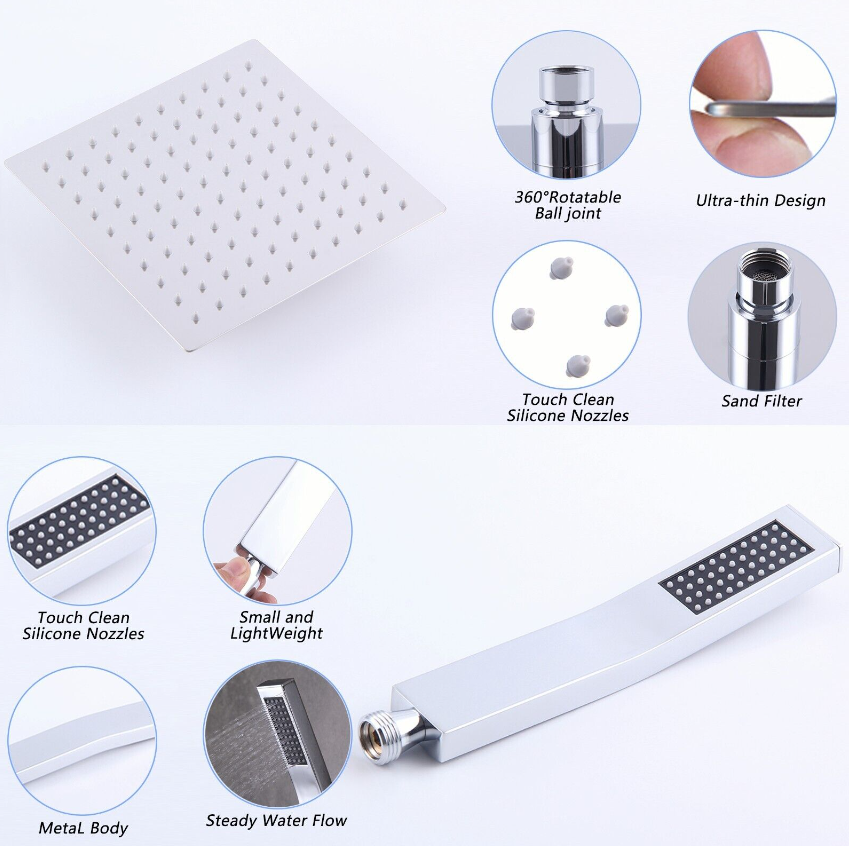 • 8 INCH HIGH-PRESSURE RAIN SHOWER HEAD: Made of all Stainless Steel no rust and no leak; Self-clean silicone nozzles for superior water flow coverage; Ultra-thin design and advanced air booster technology for high-pressure water flow, provides superior rain shower experience.