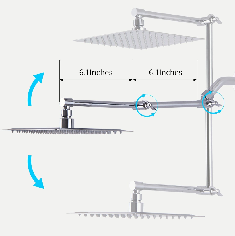 • HEIGHT AND ANGEL ADJUSTABLE EXTENSION ARM: The flexible extension arm, made of solid brass allows you to adjust the height and angle of the shower system in need, and the knobs are tight enough to ensure the showerhead can stay in place. The free-spinning locking collar allows you to tighten the extender in a correct position