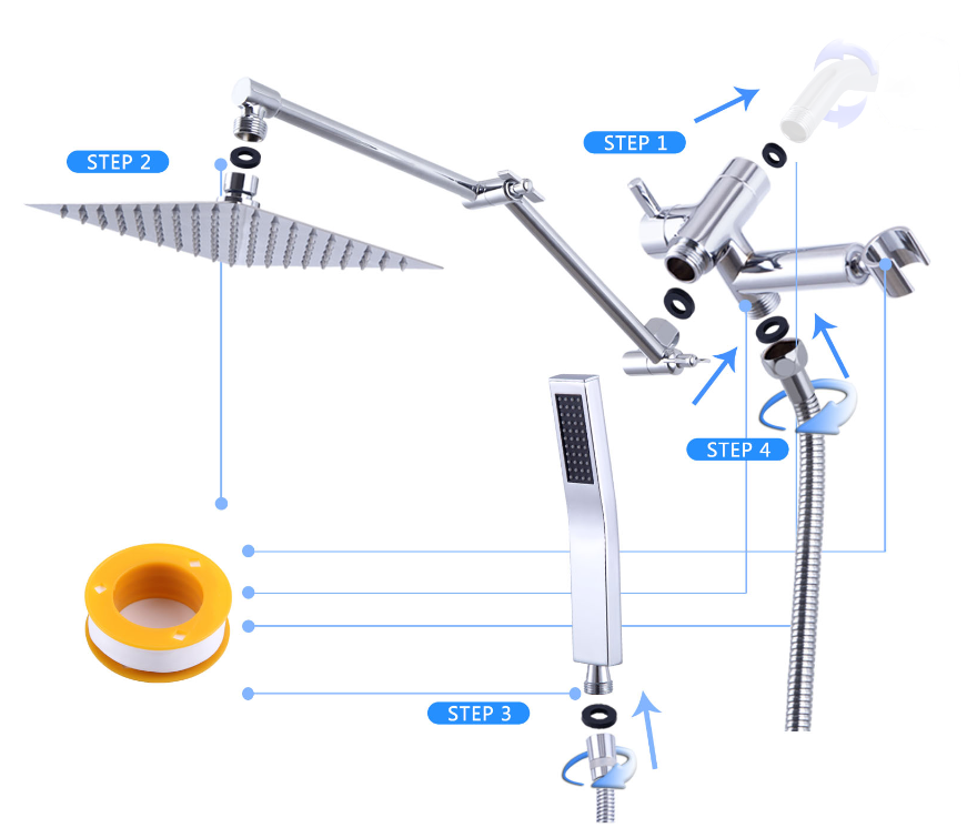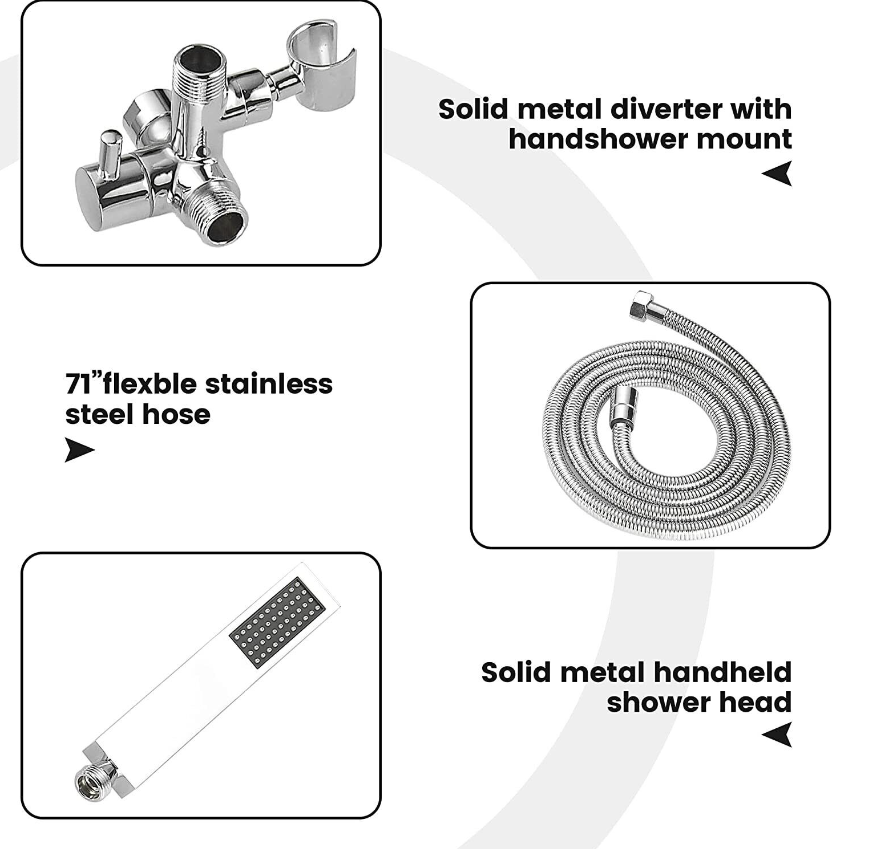 • ALL PARTS MADE OF ALL METAL AND BRASS: The rain shower head and handheld spray, the 3- way diverter with holder, extension arm, and the wall-mounted shower arm and flange are all made of all metal and brass. Solid construction ensures more durability than plastic and provides a much longer life.