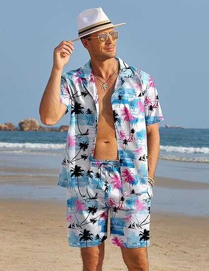 【OCCASION】: Fashionable pattern design, suitable for all ages to wear. Great for tropical aloha theme, camp, cruise, sun beach, birthday party, vacation or any casual daily wear.Simple and classic matching of shirts and shorts sets, save you the time of choosing to match.