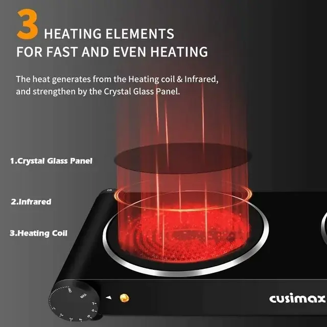 CUSIMAX 1800W Electric Double Hop Plate, Portable Burner for cooking, Electric Infrared Stove, Dual Countertop Electric Cooktop. With a mini size, Cusimax double burner is great for everyday use such as frying steak, grilling cheese, boiling water, making soup, cooking pasta, hot sauce, etc., or as an extra cooking appliance in a busy kitchen. Whether it's your home kitchen, apartment, RV, office, or back garden, it can meet your different needs.