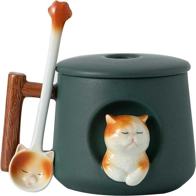 DIHOclub Adorable 3D Ceramic Cat Mug with Lid and Spoon - Perfect for Coffee, Tea, Milk, and More - Ideal Gift for Animal Lovers - 14 Ounces (Green)