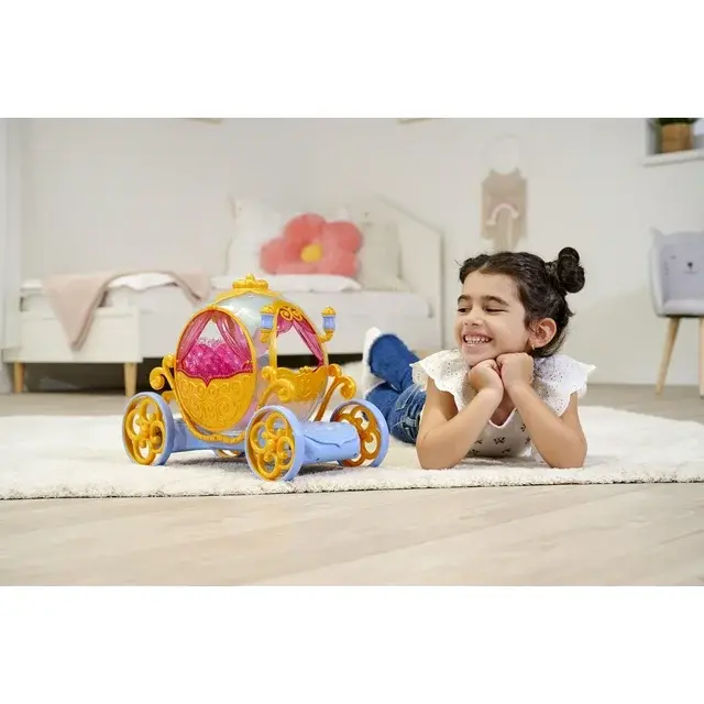 This Princess Carriage is for you!  Place your favorite Disney Princess doll in the regal coach and off you go.  Beautifully designed with swirls and scrolls, the carriage travels forward, backward and even in magical circles.  Easy to operate and perfect for indoor and outdoor fun.  Get your friends ready for the ultimate adventure