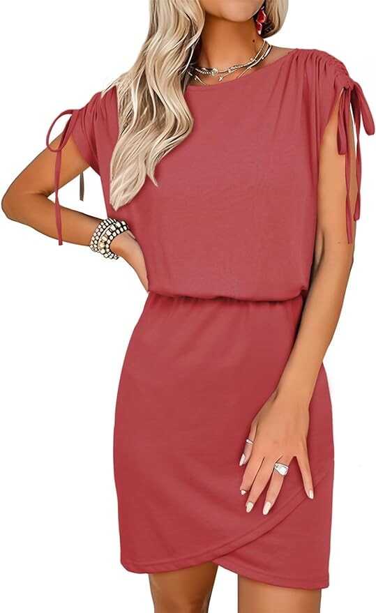 Dokotoo Womens 2024 Summer Dress Drawstring Cap Sleeve Crew Neck Wrap Bodycon Dresses Mini Short Dress