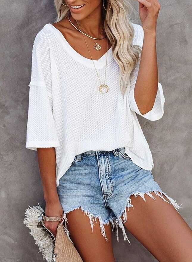 Dokotoo Women's Causual V Neck Short Sleeve Shirts Waffle Knit Loose Tunic Tops Blouses