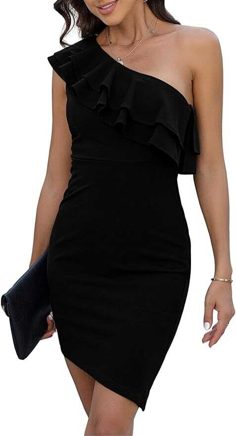 One shoulder dress features double ruffle tirm, sleeveless design, empire waist, high-low hem, side zipper closure and solid color. Stylish and elegant designs.