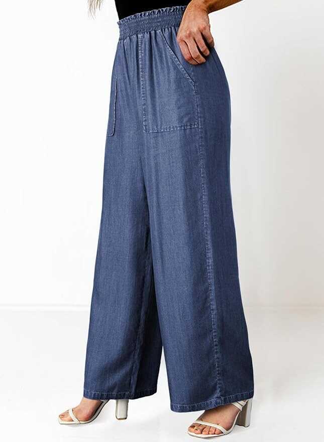 Dokotoo Womens Ruffled Smocked High Waist Slant Pocket Straight Tencel Denim Jeans Summer Lightweight Pants
