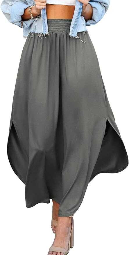 DOUBLJU Casual High Waisted Maxi Skirts with Pockets Elastic Wide Waist Band Side Deep Slit Skirt for Womens with Plus Size