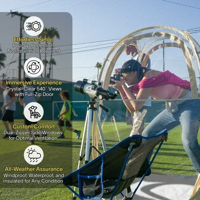 • Super clear 4 side view: this sports tent measures 40"x40"x62"H, bigger than similar products and comfortably fits 1 tall adult sitting inside. Made of super transparent PVC, it allows a clear, 540-degree view. Perfect for catching all outdoor sports action including football, baseball, soccer, lacrosse or for hobbies including fishing, photography, outdoor movies etc. Fully transparent PVC roof is perfect for night view and will make sure you don't miss any of those special moments!