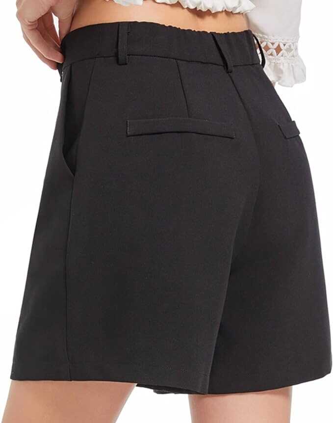 • Elegant dress shorts design with high waist, classic zipper fly with clasp close, two side pockets, elastic waist at the back, loose cut and solid color.