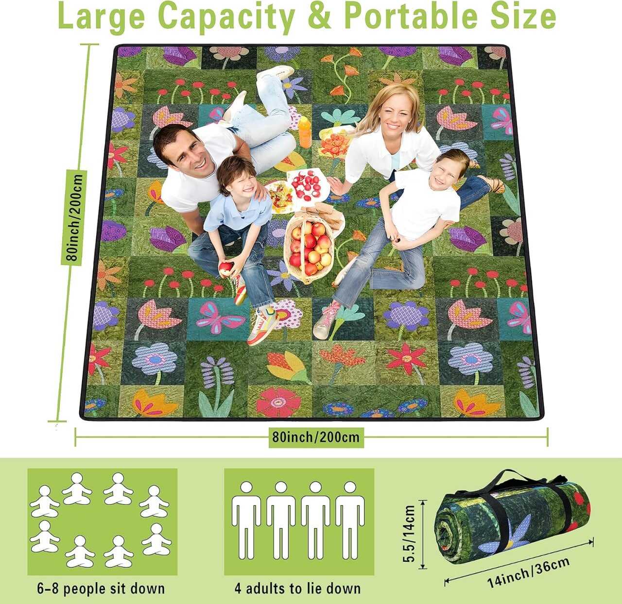 This picnic blankets measures 80”L x 60”W,is large enough for 6 adults to sit, accommodating up to 4 adults lying and provides enough space for food and drinks. Our large picnic blanket is the best choice for a family outing or friend gatherings.