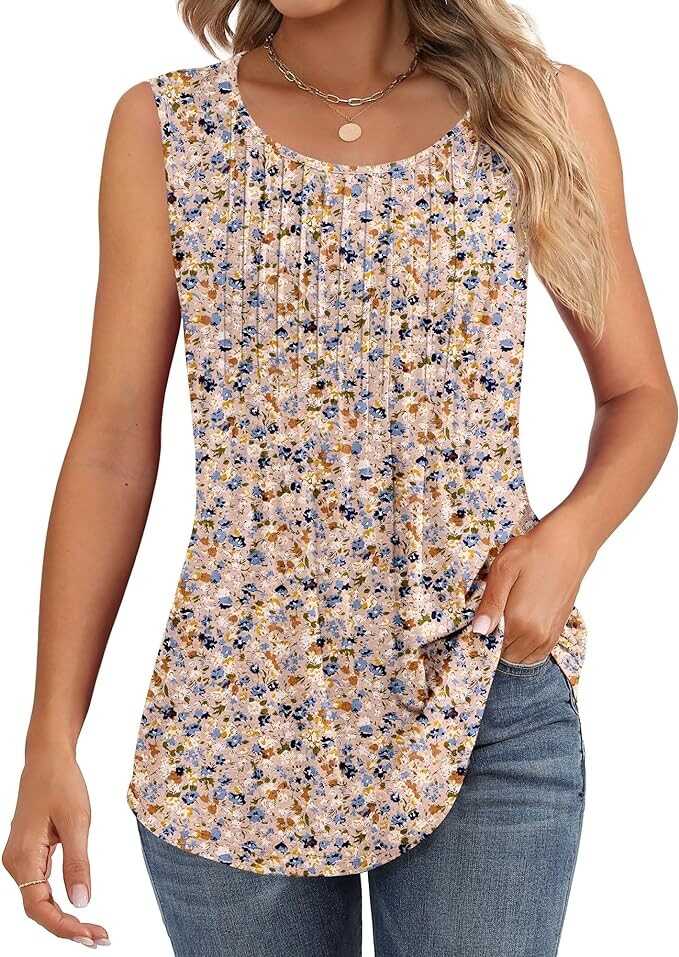 • Slim Fit Features: this women's summer sleeveless blouse features a crew neck design with pleats on the front; A pleated design in the middle tightens the waist and hides the belly, creating a slimming effect suitable for any body type; The length of this basic tank top is enough to cover your tummy and bum; Upgrade your summer wardrobe with these casual yet dressy tops and celebrate summer in style