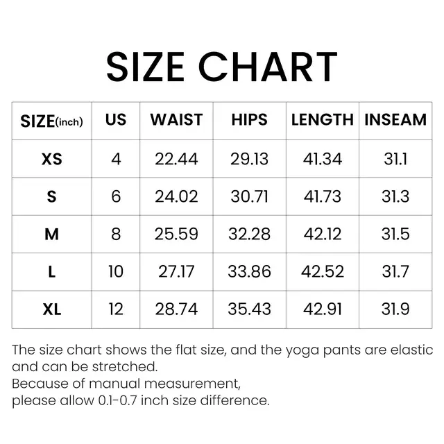 Tips: 1. Please compare the detail sizes with yours before you buy!!! 2. Colors may be slightly different depending on computer and monitor settings. 3. Please allow 0.5-1.5 inch differs due to manual measurement, thanks. Package Content: 1 x Yoga Pant