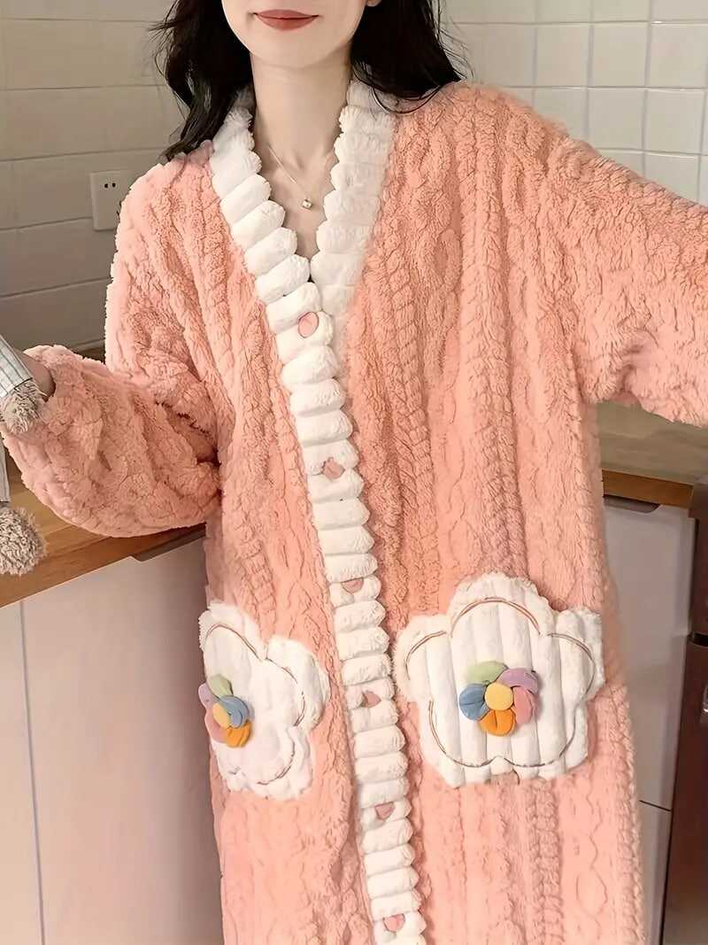 flower decor fuzzy night robe cute long sleeve v neck robe with pockets womens sleepwear details 20flower decor fuzzy night robe cute long sleeve v neck robe with pockets womens sleepwear details 20
