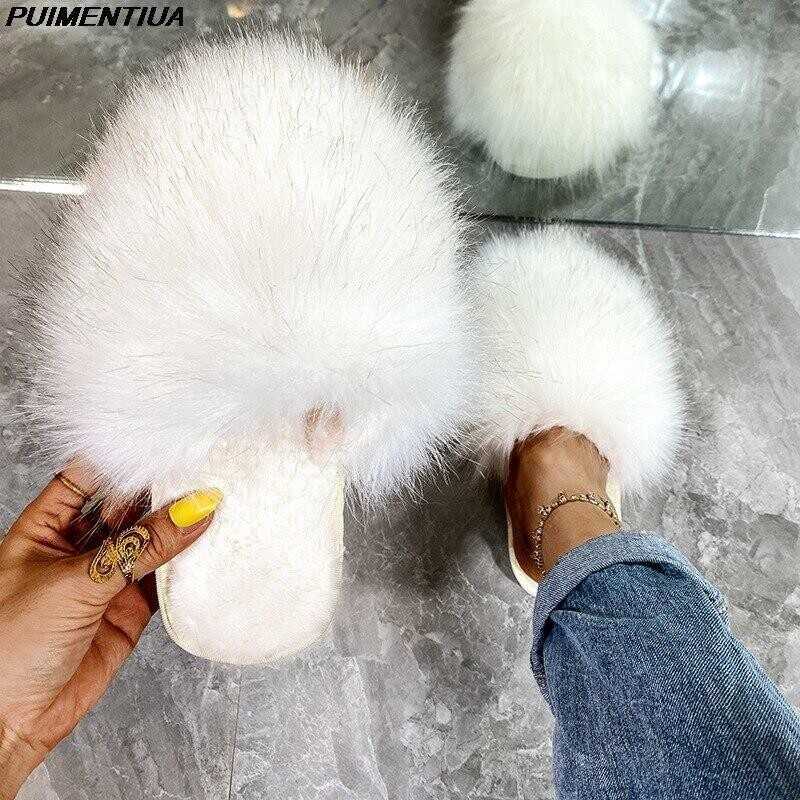 Fur Slides Women Summer Furry Slippers Fluffy Home Shoes Ladies Luxury Fur Flops