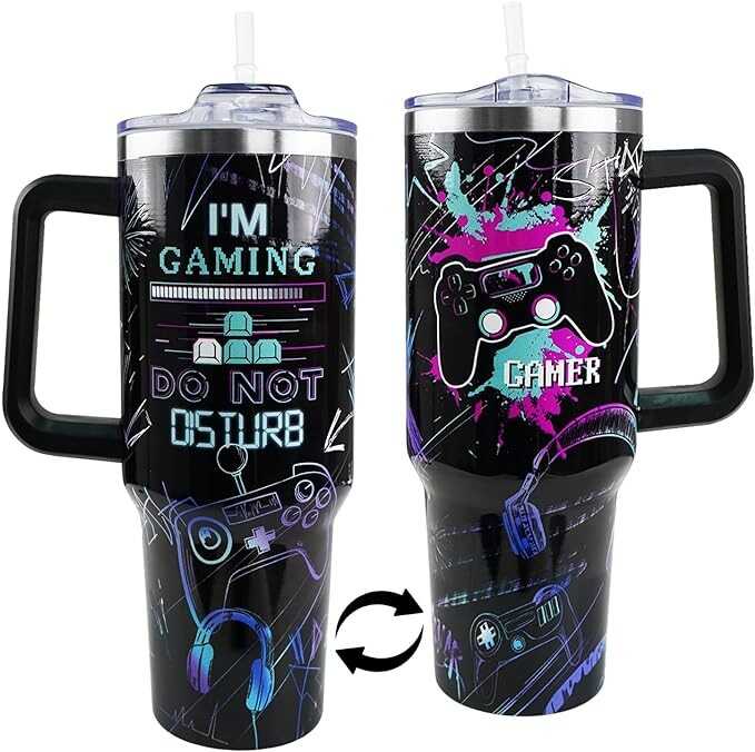 • 40 Oz Tumbler with Handle and Straw: The 40 ounce tumbler with handle has a large 40oz capacity helps you hold more water at once, and is easy to hold. The lower narrowing design of this gamer coffee travel cup tumbler fits most cup holders. These gamer cups are suitable for everyday use, coffee/tea on the go, indoor and outdoor events, travel, parties, camping, Etc.