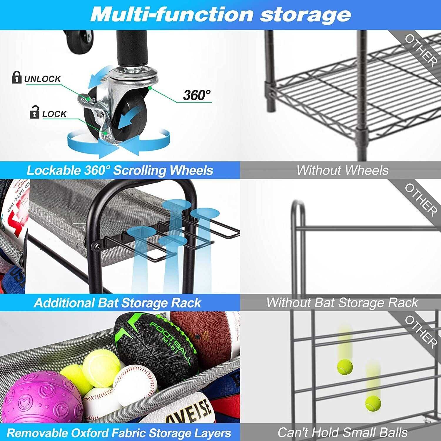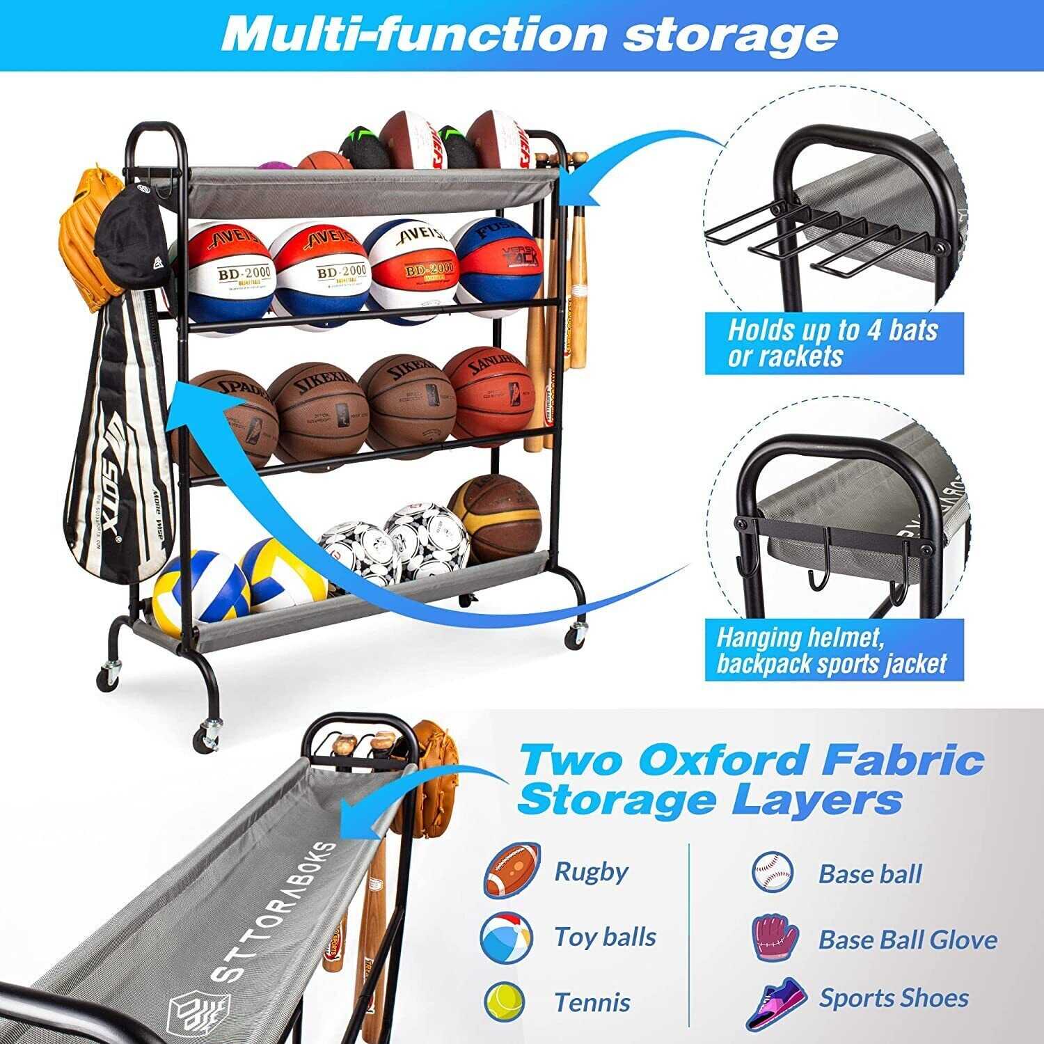 Garage Ball Storage Stand with Baseball Bat Holder & Hooks Sport Equipment Cart
